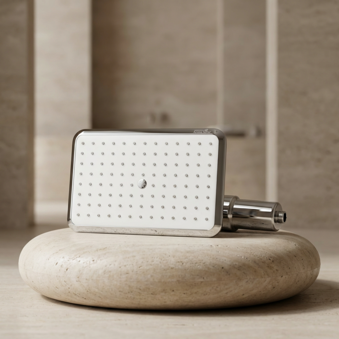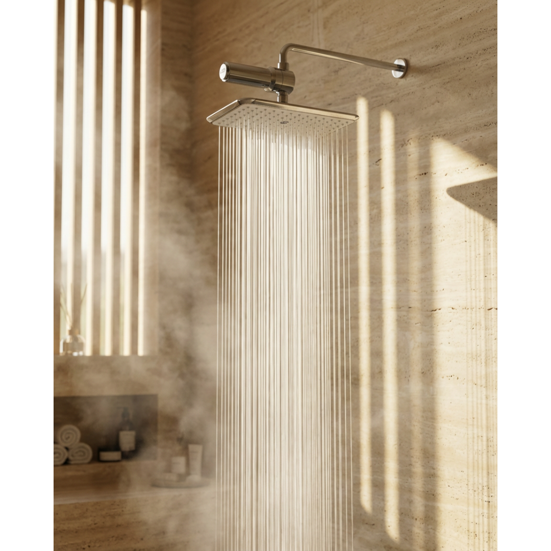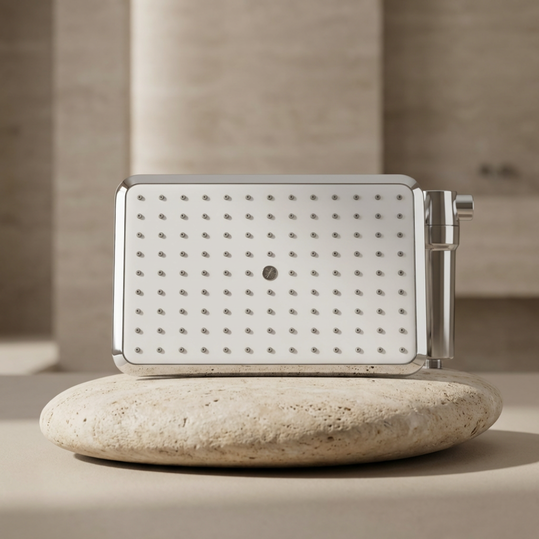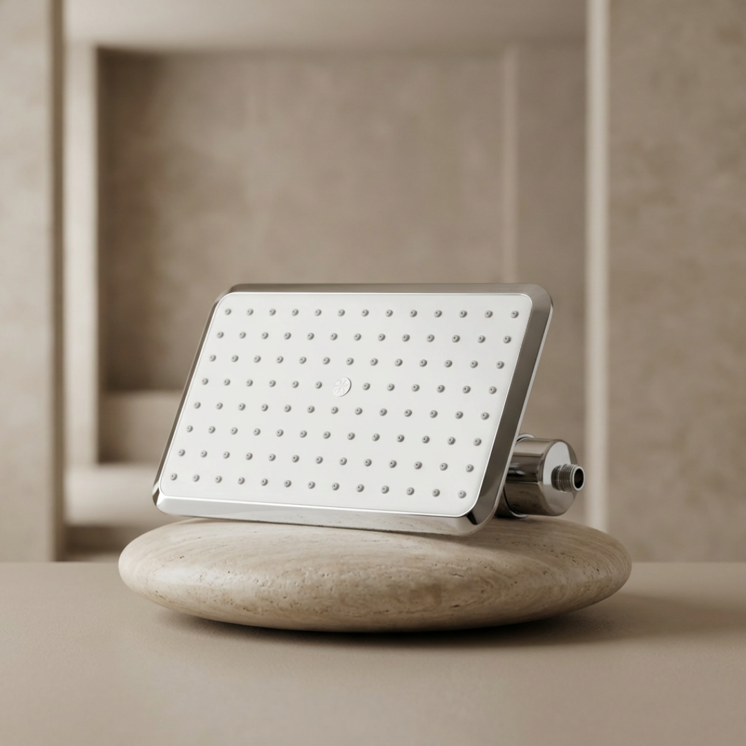 SUHAE uses Vitamin C infusion to help neutralise chlorine instantly as water flows through the system. This chemical reaction converts chlorine into less reactive compounds before the water touches your skin, making the shower feel gentler and more comfortable.