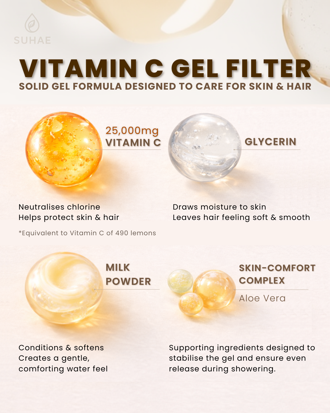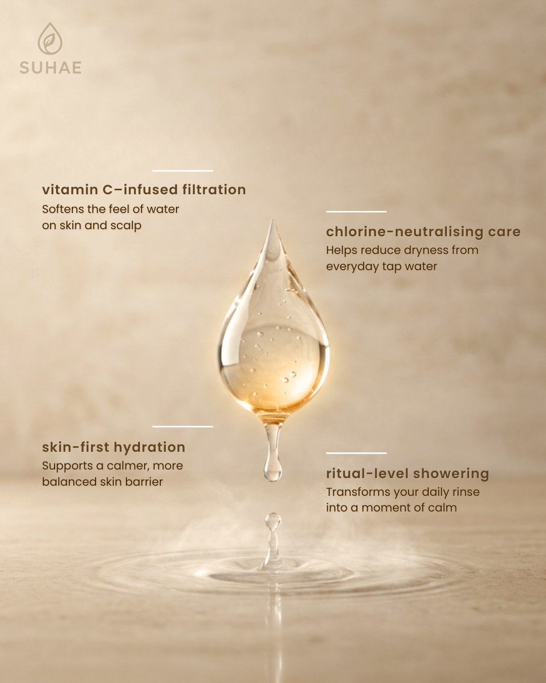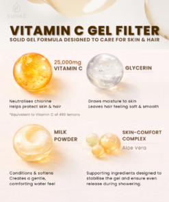 SUHAE uses Vitamin C infusion to help neutralise chlorine instantly as water flows through the system. This chemical reaction converts chlorine into less reactive compounds before the water touches your skin, making the shower feel gentler and more comfortable.